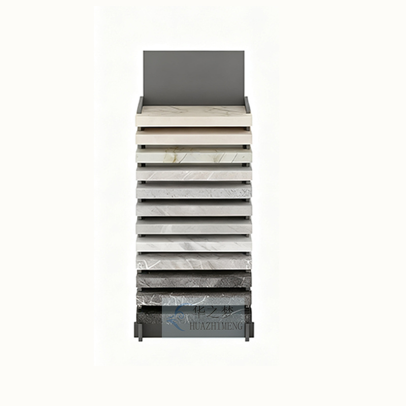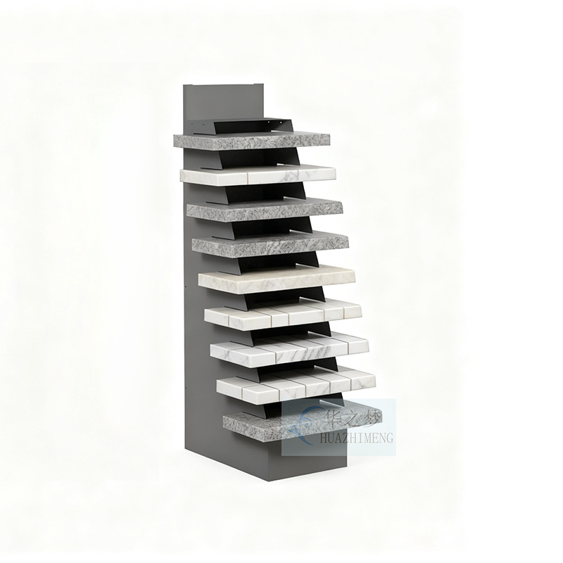 Our standing stone display rack adopts a simple single line design, with diverse and practical functions. They provide easy access to each tile sample, allowing customers to easily browse and compare different options. In addition, its compact size makes it an ideal choice for maximizing exhibition space.