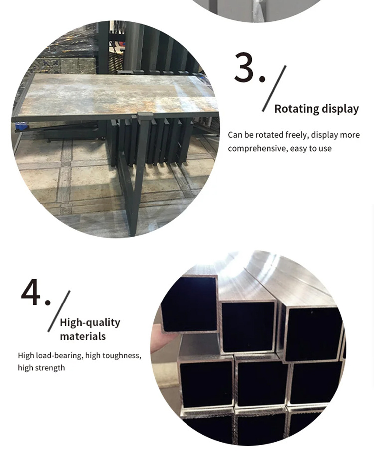 Feature highlights:This customized 360-degree rotated ceramic tile display rack is made of durable metal, featuring anti-rust properties and easy assembly. It supports size and style customization, including logo placement, with a production cycle of 15 working days and available in multiple colors such as white, black, silver, and customized options.