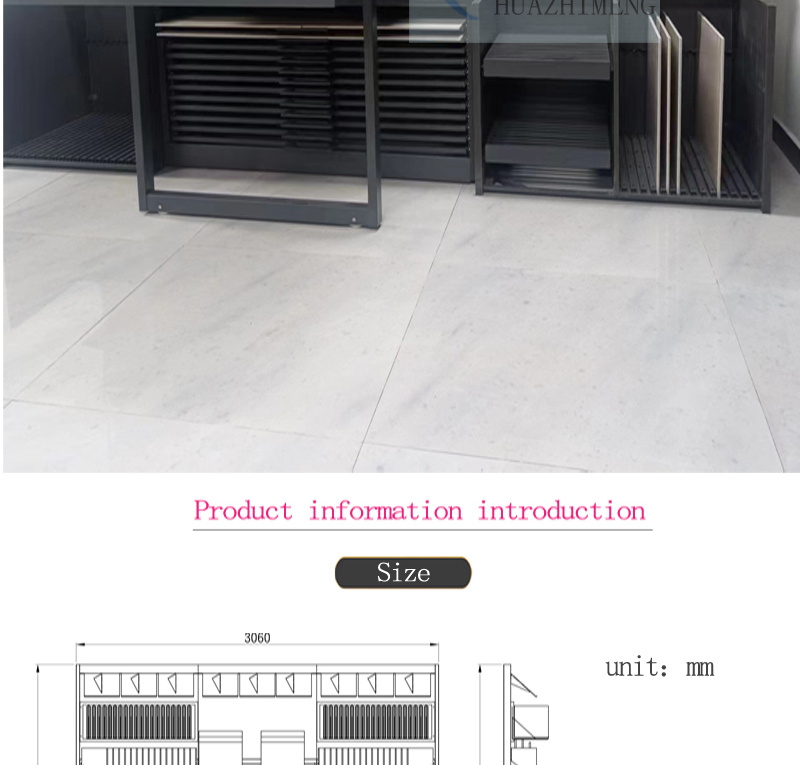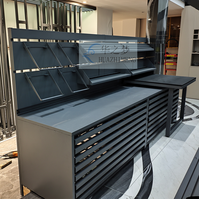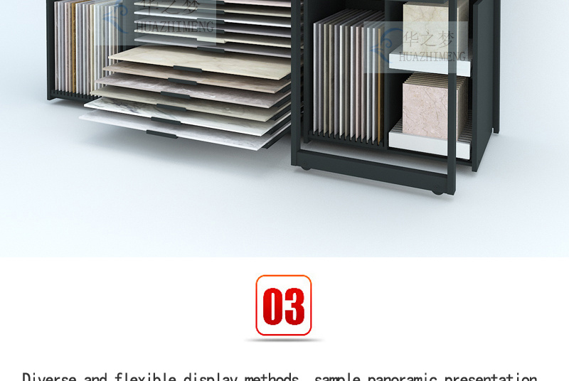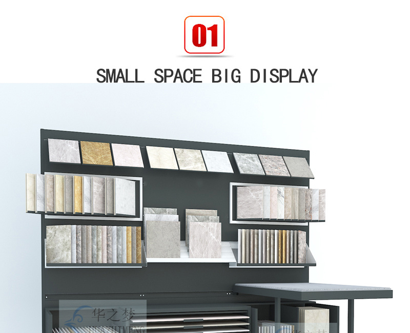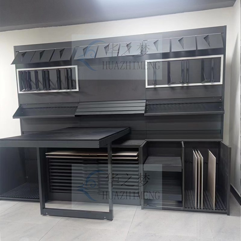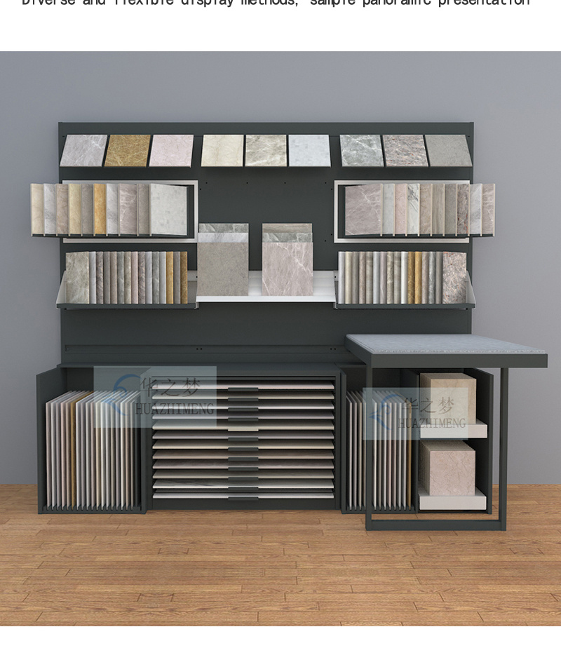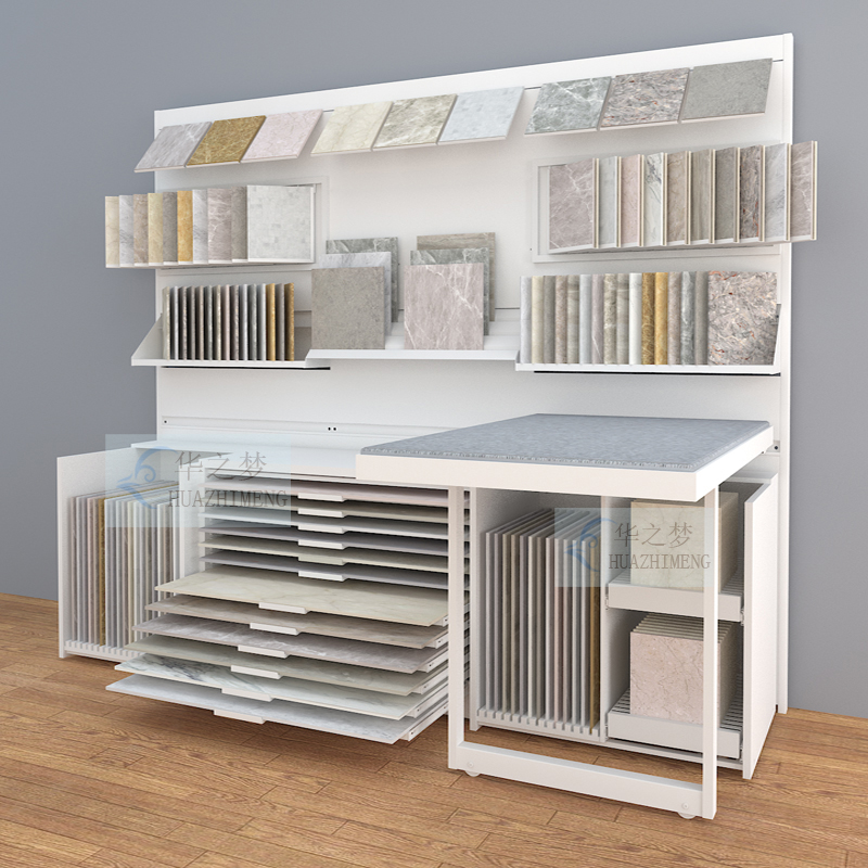 Our modular combination counter display stand features an innovative design with drawers, slots, and hanging options. Clearly highlight your sample while ensuring longevity and efficient use in any space. The multifunctional device is highly suitable for any professional environment and helps to store and display ceramic tile and stone samples in a stylish and orderly manner.