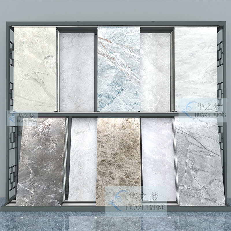 The display rack adopts a smooth push-pull system and adjustable design, displaying tiles of different sizes in one unit for easy viewing and comparison of samples. The double-layer display maximizes the saving of exhibition space and is constructed with high-quality metal materials to ensure long-term strength and stability.