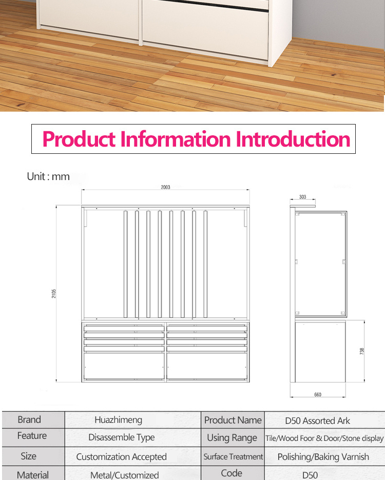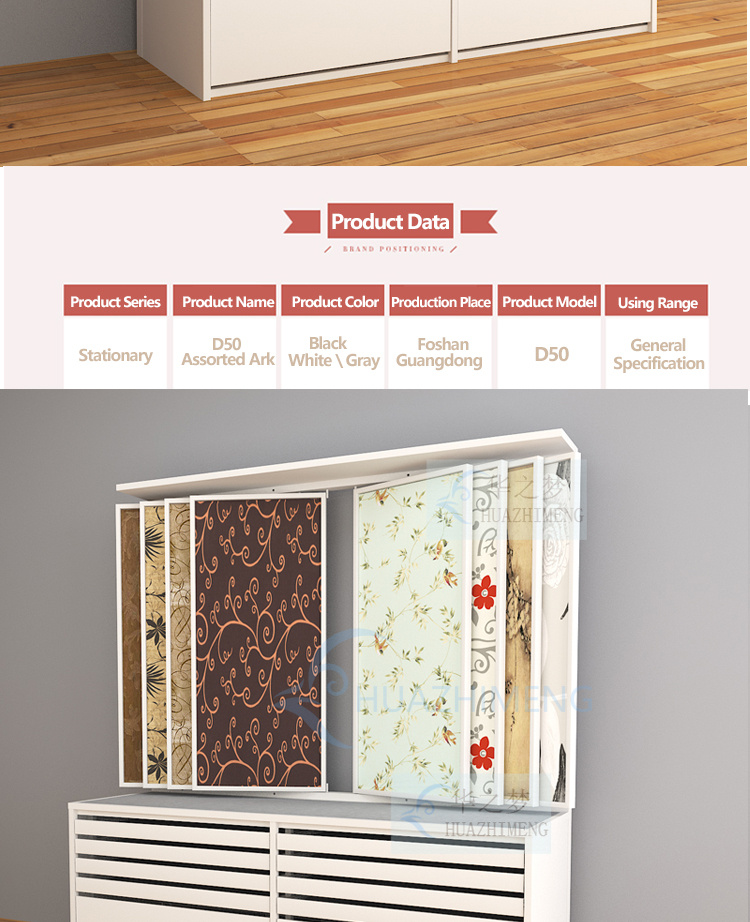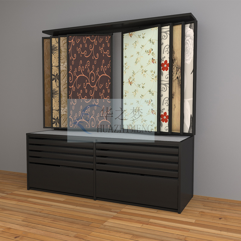 The display rack has a page flipping display system that allows access to samples like flipping through a book. Therefore, each wallpaper or wall panel sample can be clearly seen without overlap or clutter.