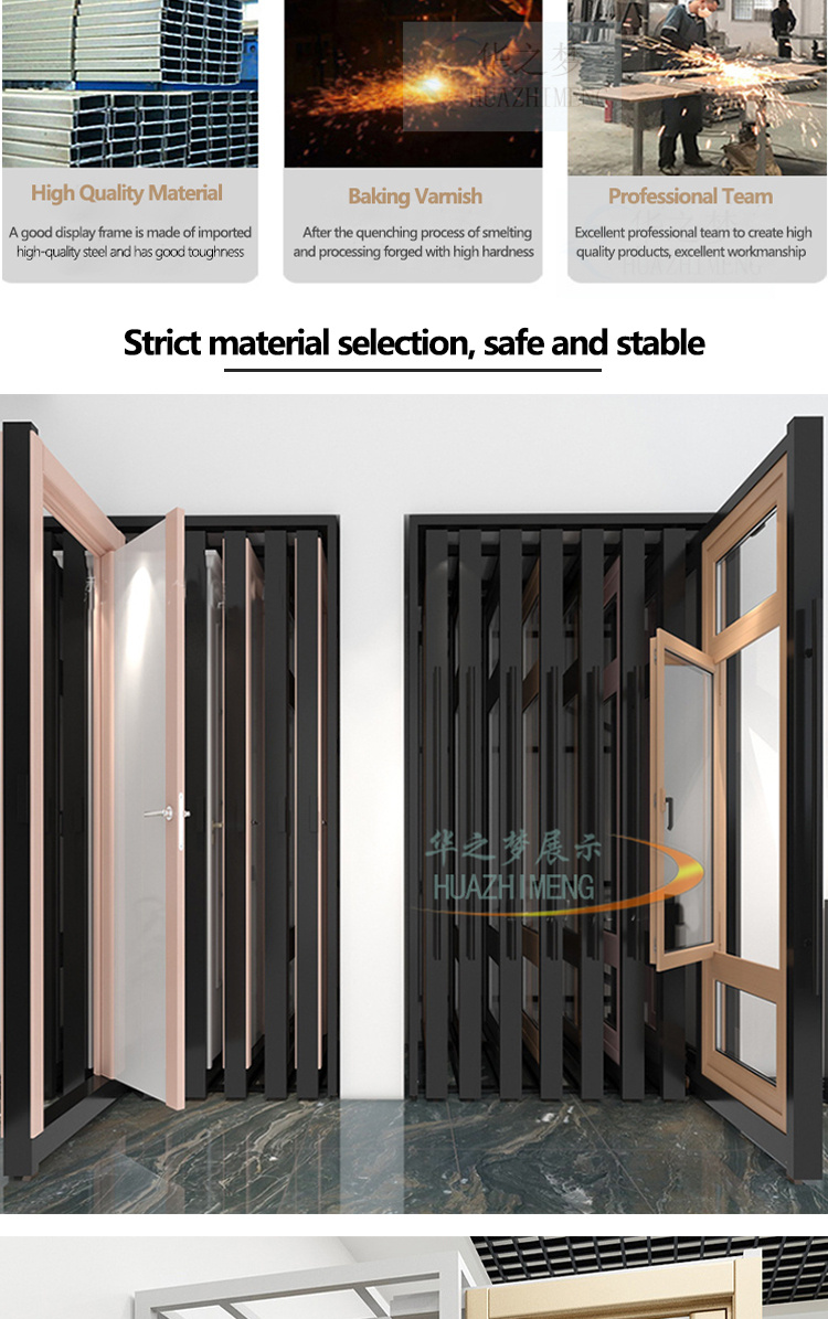 Feature highlights:This modern style sliding door display rack is crafted from high-end cold steel with a powder-coated surface treatment, ensuring durability and a sleek appearance. It is customizable in size, color, and logo printing, making it ideal for tile showrooms or retail displays. The product supports OEM & ODM services and comes with easy assembly instructions. Suitable for indoor use, it offers versatile design options including horizontal and vertical orientations.