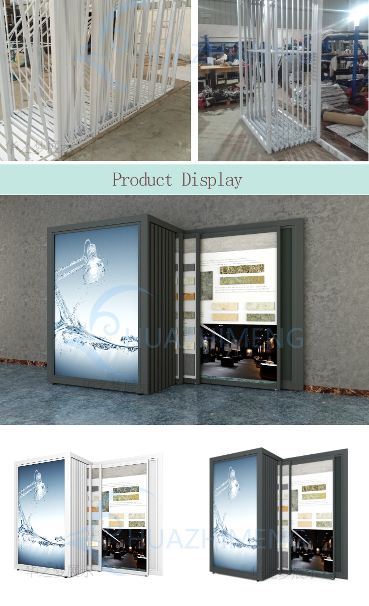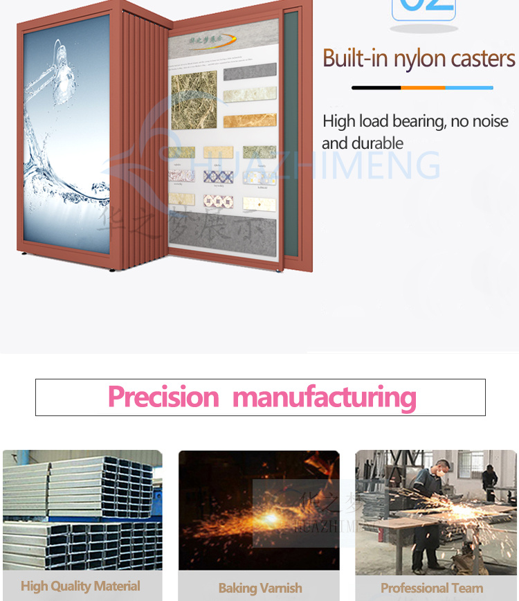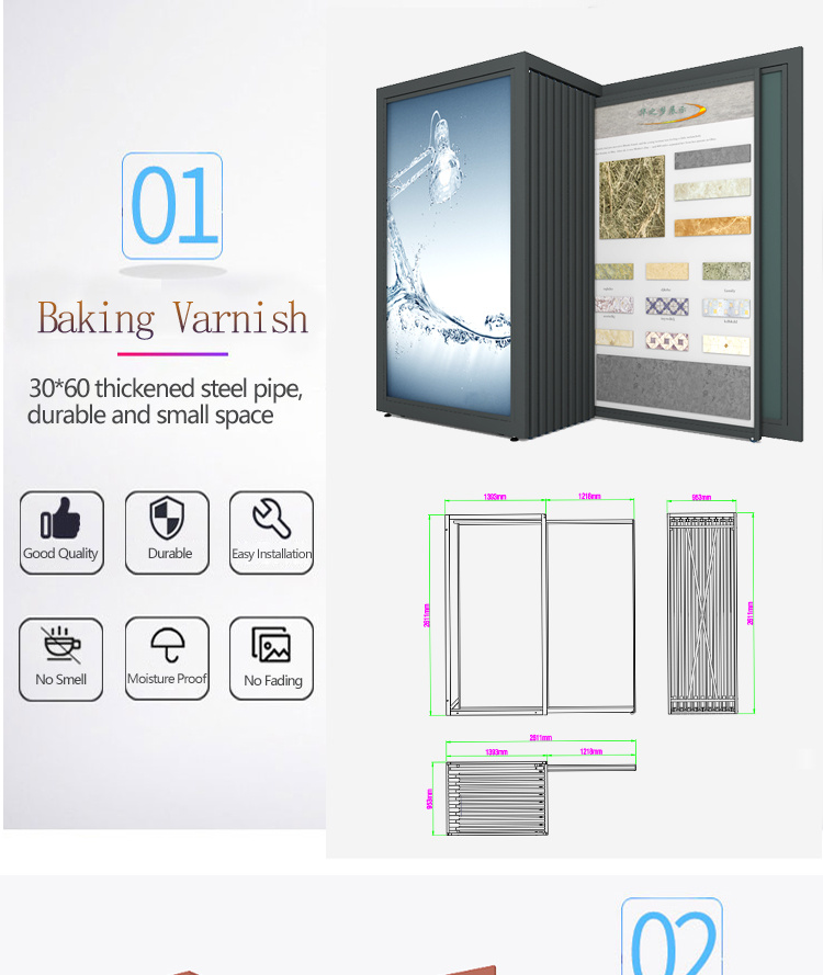 The pull-out display rack is specifically designed for showcasing large stone and ceramic tiles in modern exhibition halls. Maximized storage and display efficiency. Provide free design support and customized sample sizes.